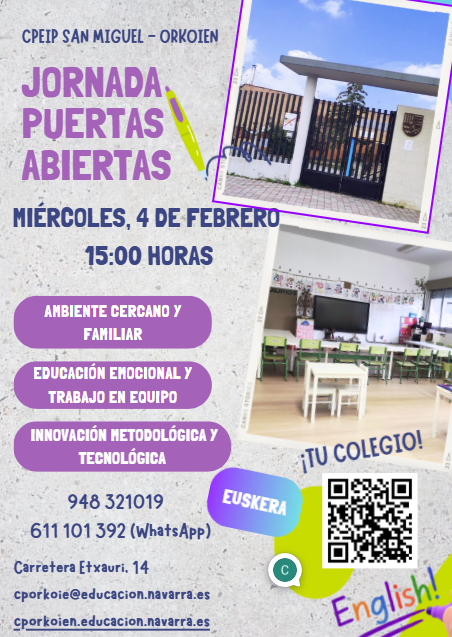 El próximo miércoles, 4 de febrero, a las 15 horas tendremos la Jornada de puertas abiertas en nuestro centro. Explicaremos nuestro proyecto educativo, las actividades y los proyectos que estamos llevando a cabo. Os animamos a conocerlo y visitarlo. ¡Os esperamos!